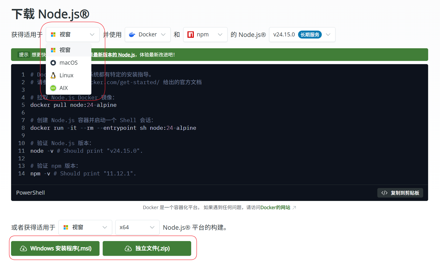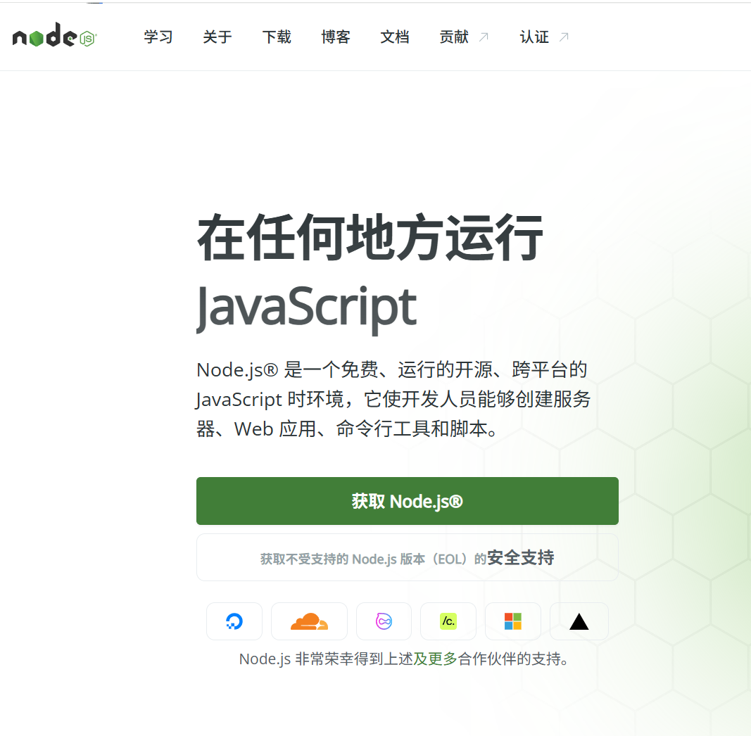 Node.js:访问 Node.js 官网 下载 LTS 版本的 .msi 安装包,双击运行,按向导默认设置完成